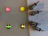 Fra venstre på billede: Rund med tilledninger, 8,5 mmø hul, Rund, rød, 9,5 mmø, Firkantet, rød, orange, grøn 9,5 mmø, firk...